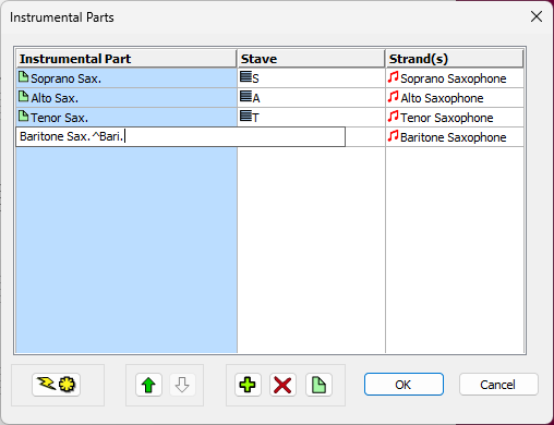 The Instrumental Part names (in the left hand column) have been adopted from the stave labels. In this case they will not make adequate Instrumental Part labels, and so they should be edited here in situ: